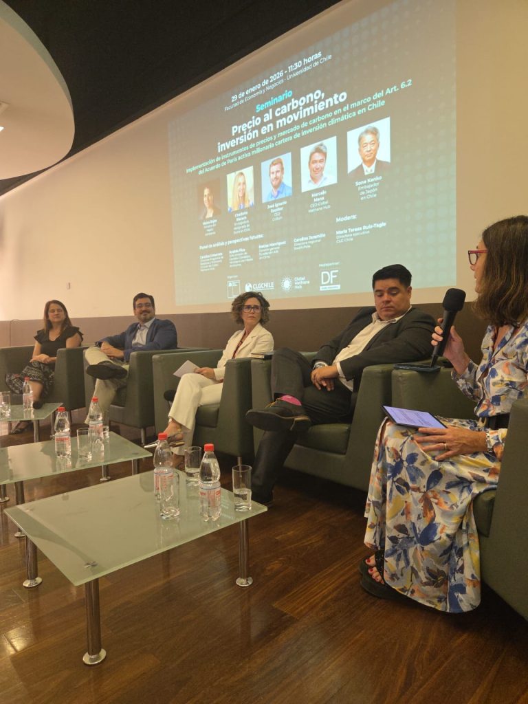 El programa incluyó el panel “Bonos de carbono e inversión: del marco habilitante a proyectos”, con la participación de Andrés Pica (jefe de la División de Cambio Climático del Ministerio del Medio Ambiente), Matías Manríquez (gerente general de Klik Foundation), Carolina Urmeneta (directora del Programa de Residuos y Economía Circular de Global Methane Hub) y Carolina Jaramillo (directora regional de South Pole). La conversación fue moderada por María Teresa Ruiz-Tagle, directora ejecutiva de CLG Chile.